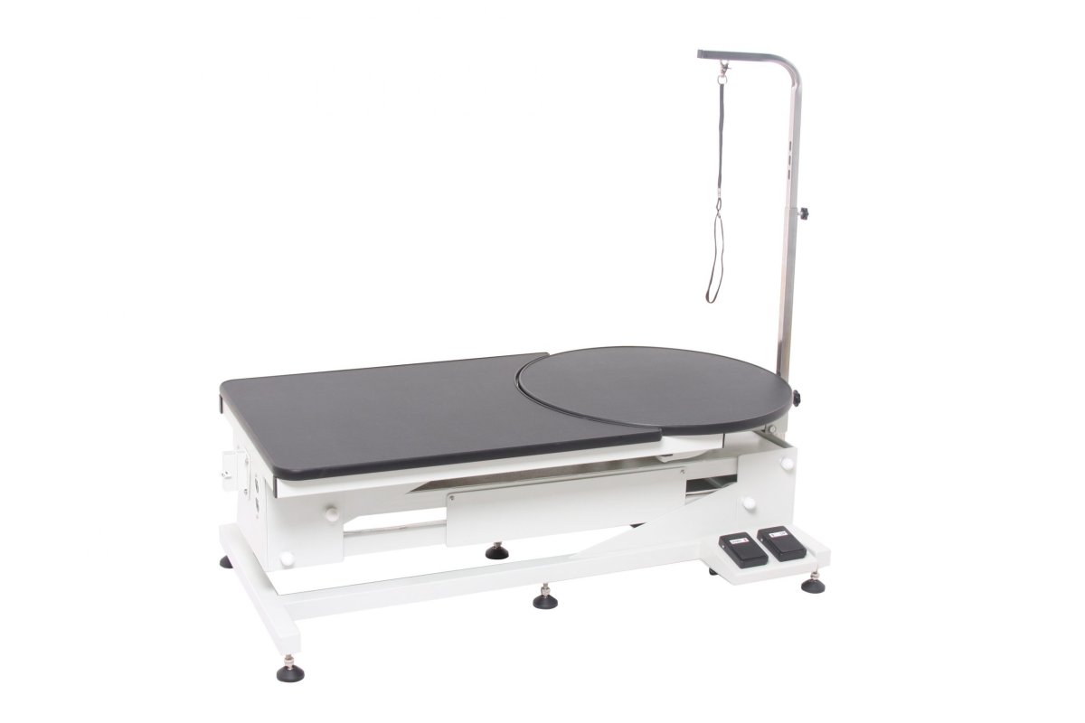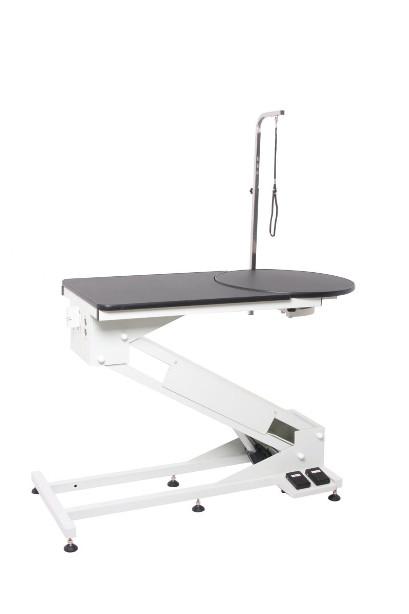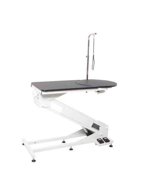 Tavolo per toelettatura con altezza regolabile elettricamente da i 25 cm e i 122 cm per agevolarne l’uso con animali di grossa taglia o malati. La portata di 160 Kg e le dimensioni (120 cm x 60 cm) ne garantiscono l’uso con animali di qualunque taglia. Il tavolo è equipaggiato con una tavola rotante e di braccio dotato di lacci in nylon per poter assicurare il cane. Il braccio, oltre ad essere regolabile in altezza può anche essere angolato (48°). Doppia pedaliera elettrica di regolazione water-resistance