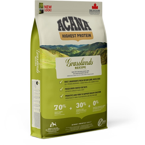 Alimento secco completo e bilanciato per cani Acana Grasslands, ricco di agnello, anatra, uova e pesce. Formula senza cereali per una digestione ottimale. Disponibile in diversi formati.