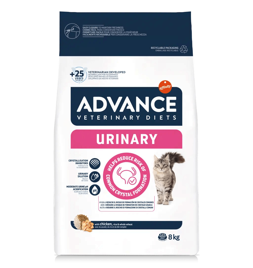Advance Vet Urinary è un alimento dietetico completo per gatti adulti con problemi urinari. Disponibile in diversi formati.