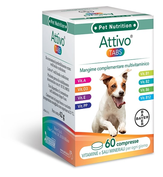 Attivo Tabs 60cps: Integratore multivitaminico per cani, ideale per supportare la vitalità e il benessere generale. Ricco di vitamine e minerali essenziali.