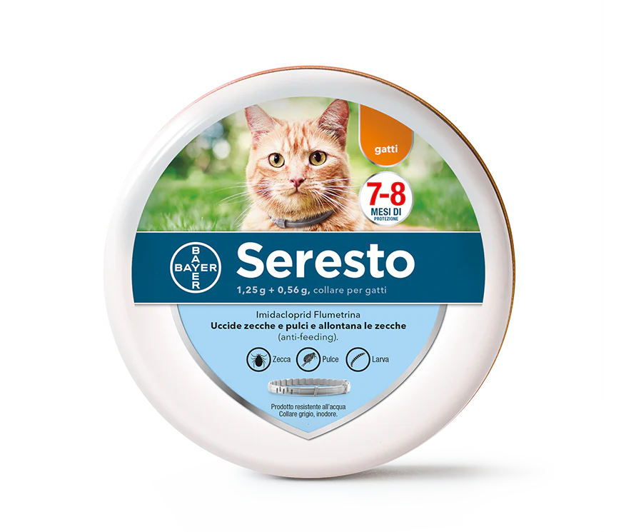 Seresto è un collare antiparassitario contro pulci e zecche con alcune caratteristiche particolari. Usa una combinazione innovativa di materiali che permette di rilasciare in modo controllato dosi basse dei principi attivi fino a 8 mesi. Ciò offre un’elevata protezione del gatto che non è limitata alla sola uccisione di pulci e zecche, ma agisce anche repellendo le zecche prima che possano pungere, cosa che facilita la protezione dell’animale contro le malattie trasmesse da questi parassiti. Seresto è una soluzione semplice e pratica al problema delle pulci e delle zecche offrendo fino a 8 mesi di protezione con un’unica applicazione. È un modo semplice che vi aiuta a tenere sotto controllo con successo pulci e zecche.