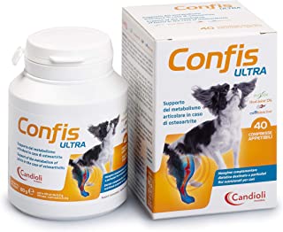 Confis Ultra è un mangime complementare per cani che supporta il metabolismo articolare in caso di osteoartrite. Con Glucosamina, Condroitina e Acido Ialuronico. Confezione da 40 compresse.