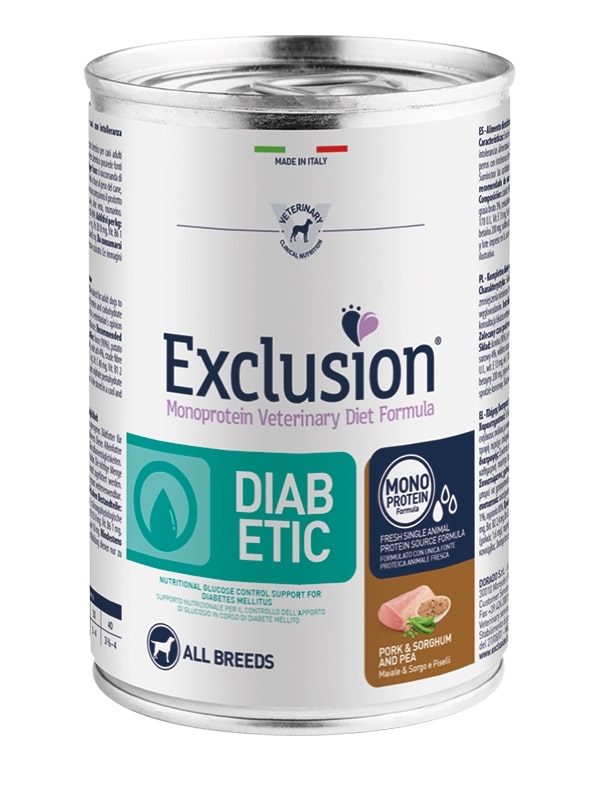 Exclusion Diabetic Maiale e Sorgo è un alimento completo dietetico, specificamente formulato per cani adulti affetti da diabete mellito. Questo cibo umido monoproteico, prodotto da Exclusion, utilizza una sola fonte di proteina animale (maiale) e sorgo, un cereale a basso indice glicemico, per aiutare a controllare i livelli di glucosio nel sangue.