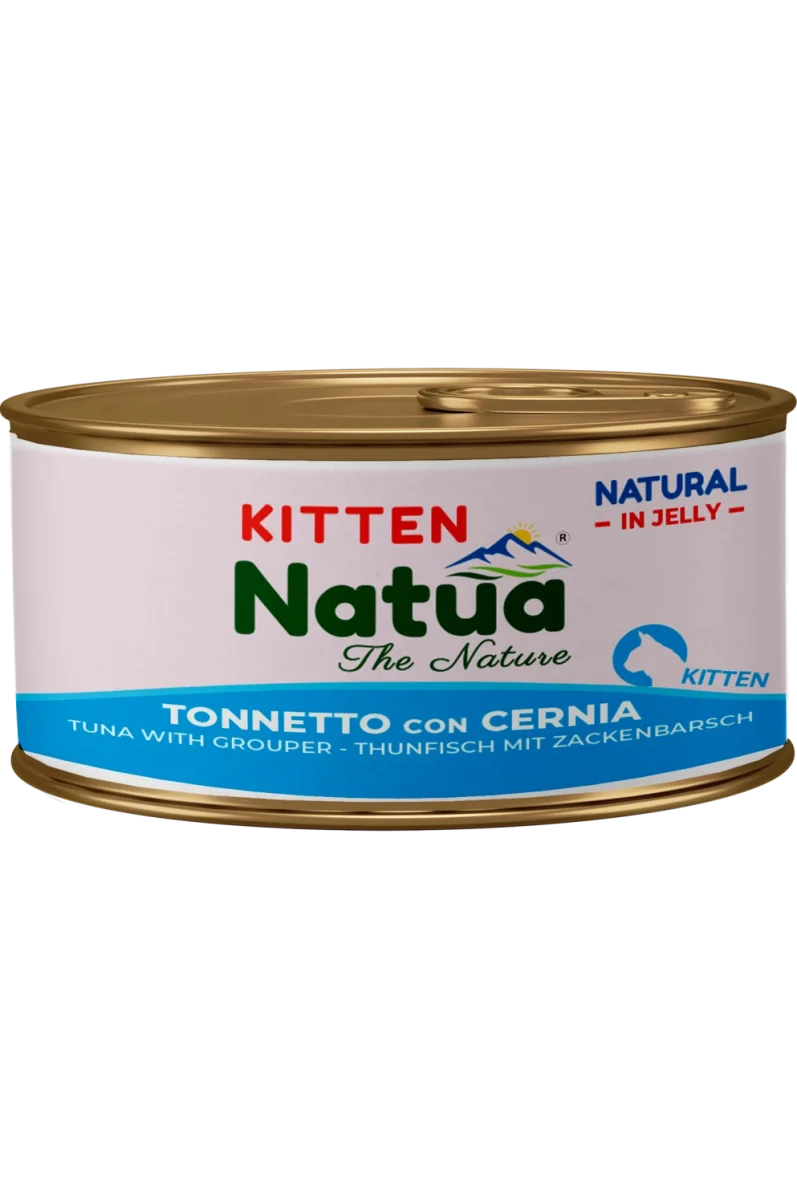 Natua Kitten in Gelatina: alimento umido completo e bilanciato per gattini in crescita. Disponibile in tre deliziosi gusti: tonnetto con dentice, tonnetto con pesce azzurro e pollo con prosciutto.