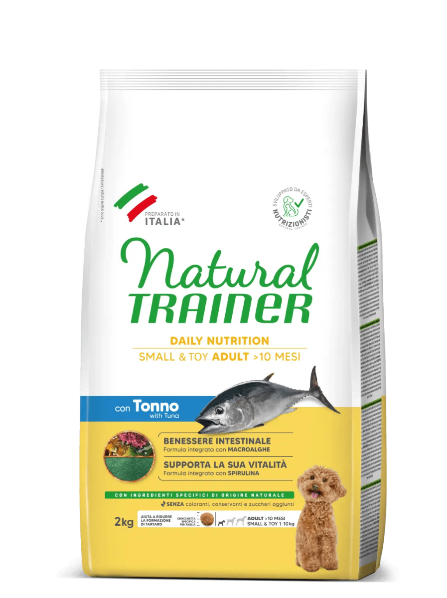 Natural Trainer Small&Toy Adult con Tonno: alimento completo per cani di piccola taglia, disponibile in diversi formati per soddisfare le esigenze del tuo pet.