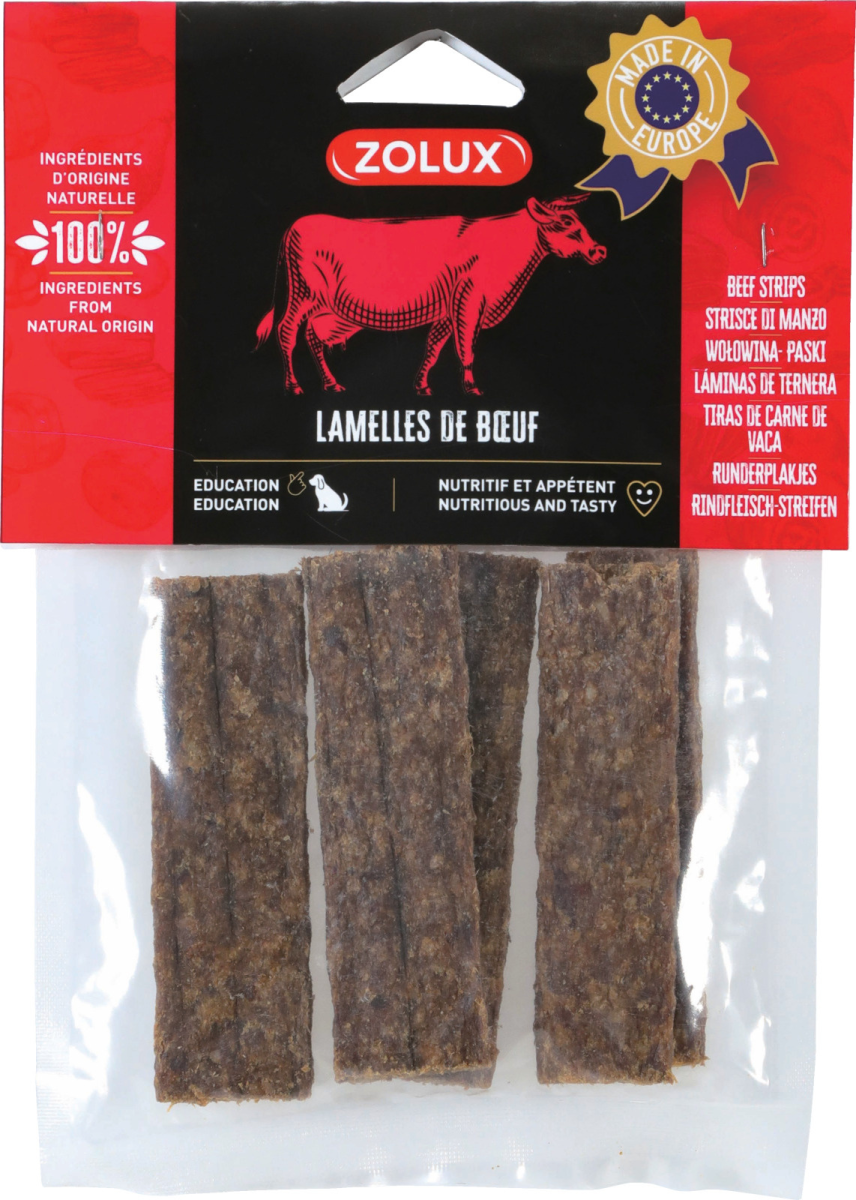 Deliziose lamelle di manzo Zolux, snack gustoso e nutriente per cani di tutte le taglie. Perfette come ricompensa o snack quotidiano.